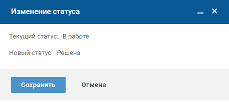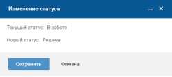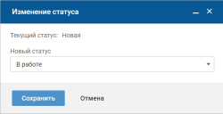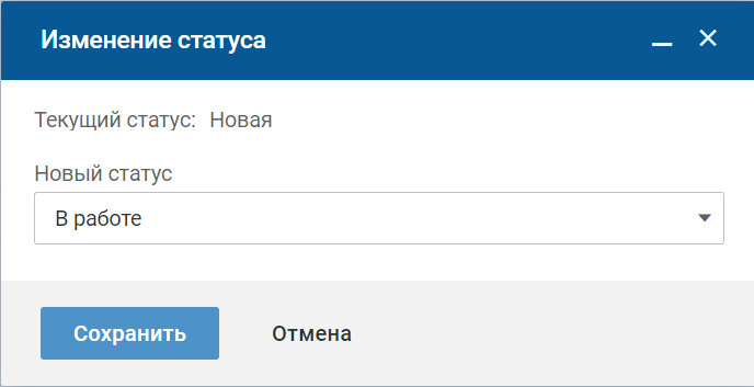 Чтобы начать работу с задачей в статусе "Новая", в карточке задачи нажмите кнопку "В работу". На форме изменения статуса нажмите кнопку "Сохранить".