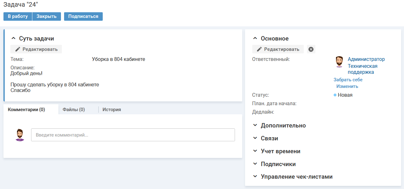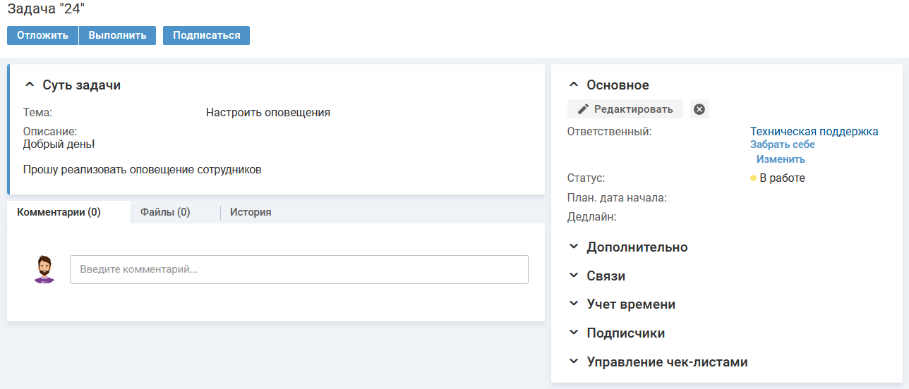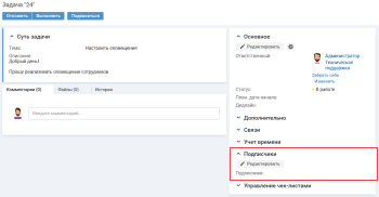 Специалист может подписаться на задачу. Подписчики задачи будут оповещаться о событиях, связанных с задачей, например, добавление комментария, смена статуса. У подписчиков есть возможность отписаться от задачи.