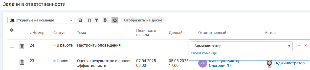 Чтобы передать задачу в ответственность своей команды, на форме изменения ответственного нажмите ссылку "своей команде" и иконку