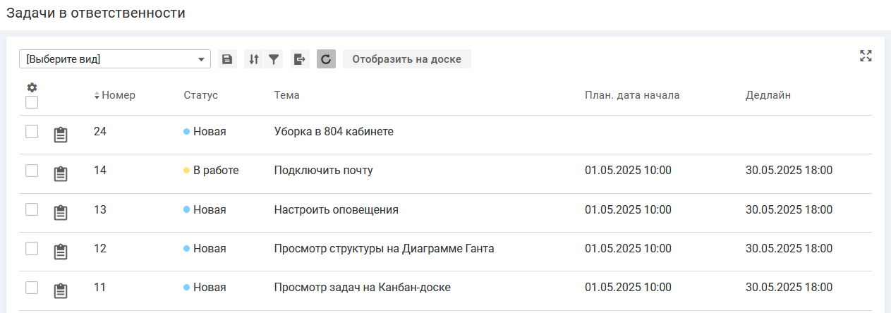 Список задач в ответственности можно отобразить на интерактивной доске, нажав кнопку "Отобразить на доске" на панели действий со списком.