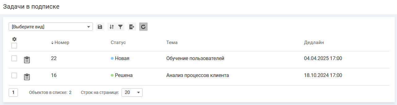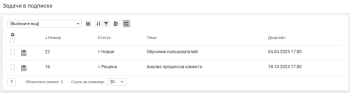 Чтобы посмотреть список задач, в левом меню выберите "Мои подписки" → "Задачи в подписке".