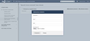 Чтобы добавить новый элемент справочника, откройте страницу соответствующего справочника и нажмите кнопку "Добавить элемент". На форме добавления укажите параметры элемента справочника и нажмите кнопку "Сохранить".