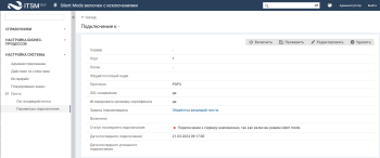 Чтобы просмотреть текущие параметры подключения к серверу входящей почты, в навигационном меню выберите "Настройка системы" → "Почта" → "Параметры подключения" (вкладка "Входящая почта").