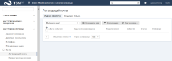 Чтобы просмотреть журнал обработки почты, в навигационном меню выберите "Настройка системы" → "Почта" → "Лог входящей почты".