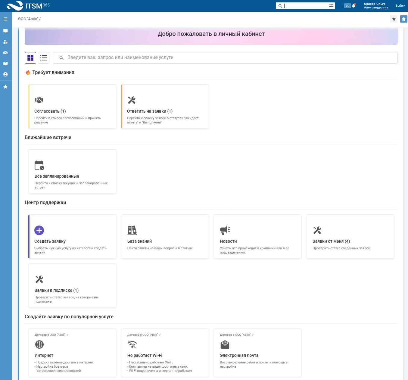 - Блок "Создайте заявку по популярной услуге" содержит плашки популярных услуг для регистрации заявки. Блок отображаются, если в системе указаны популярные услуги, и пользователь получает эти услуги.
