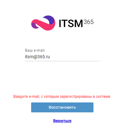 Если указать почту, несуществующую в системе, отобразится ошибка.