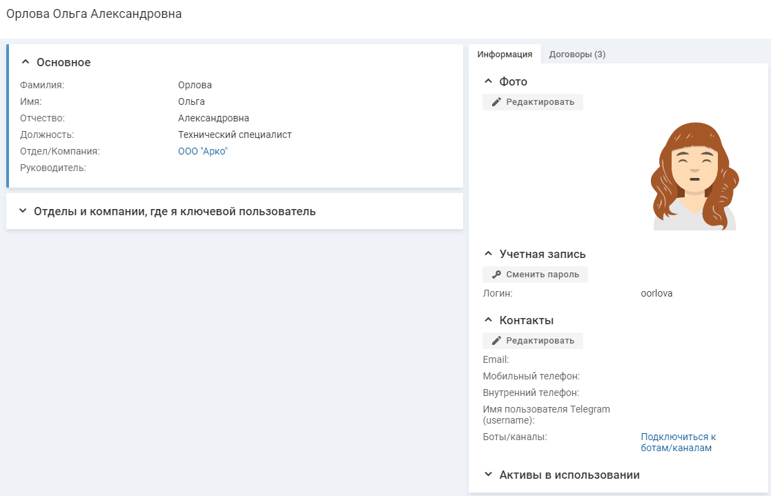 • блок "Основное" содержит информацию: ФИО, должность, отдел/компания, руководитель.