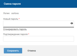 На форме "Смена пароля" укажите параметры нового пароля и нажмите кнопку "Сохранить".