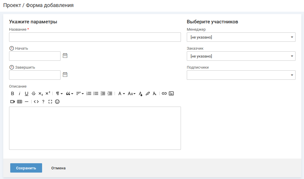 - "Заказчик" — выберите пользователя или компанию / объект обслуживания / отдел, которые являются заказчиками проекта;