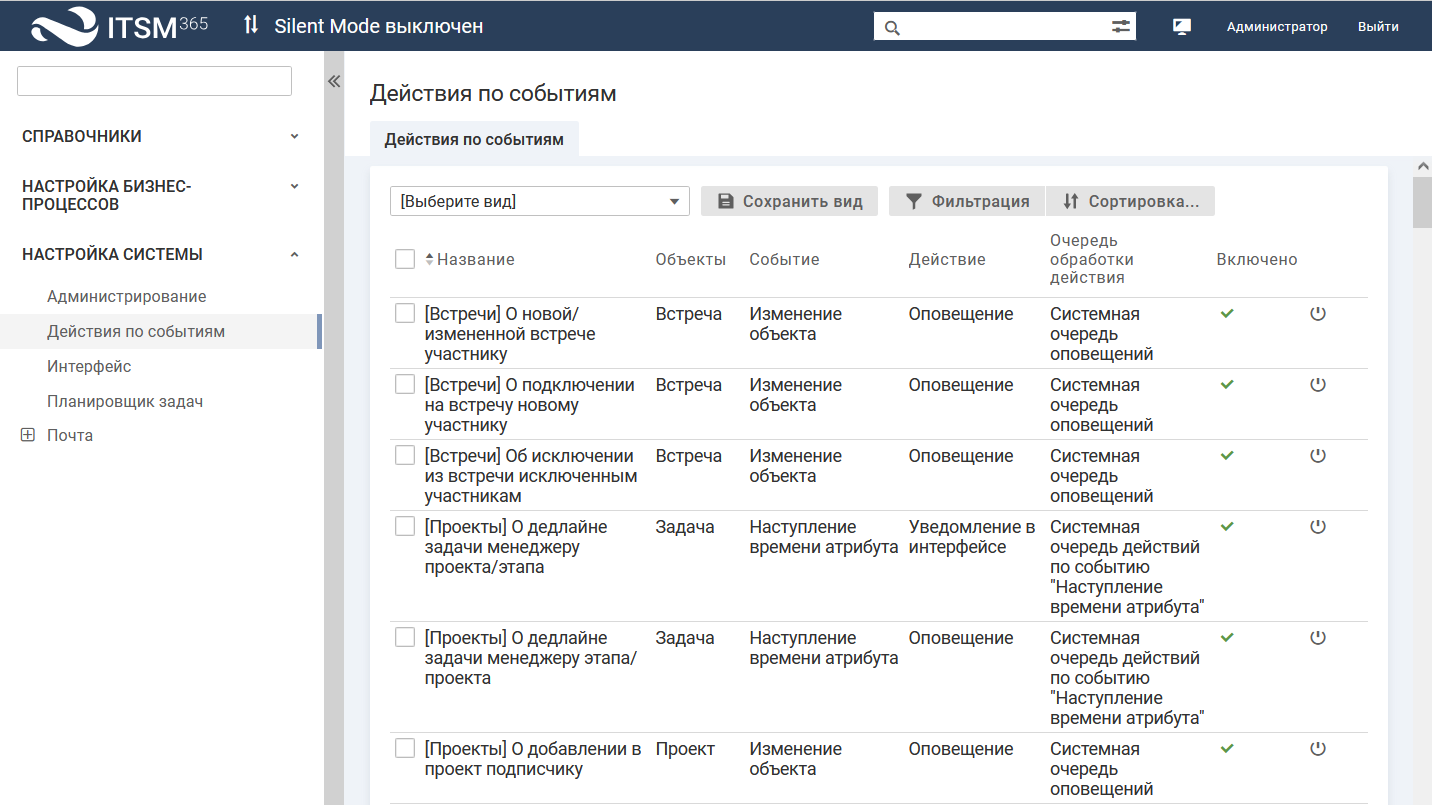 В системе существует готовый набор оповещений и уведомлений в интерфейсе. По умолчанию все оповещения и уведомлений в интерфейсе включены. Пользователь с правами Администратора может отключить неиспользуемые оповещения и уведомления в интерфейсе.