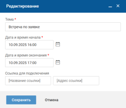 Чтобы изменить детали встречи, в карточке встречи в блоке "Детали встречи" нажмите кнопку Редактировать.
