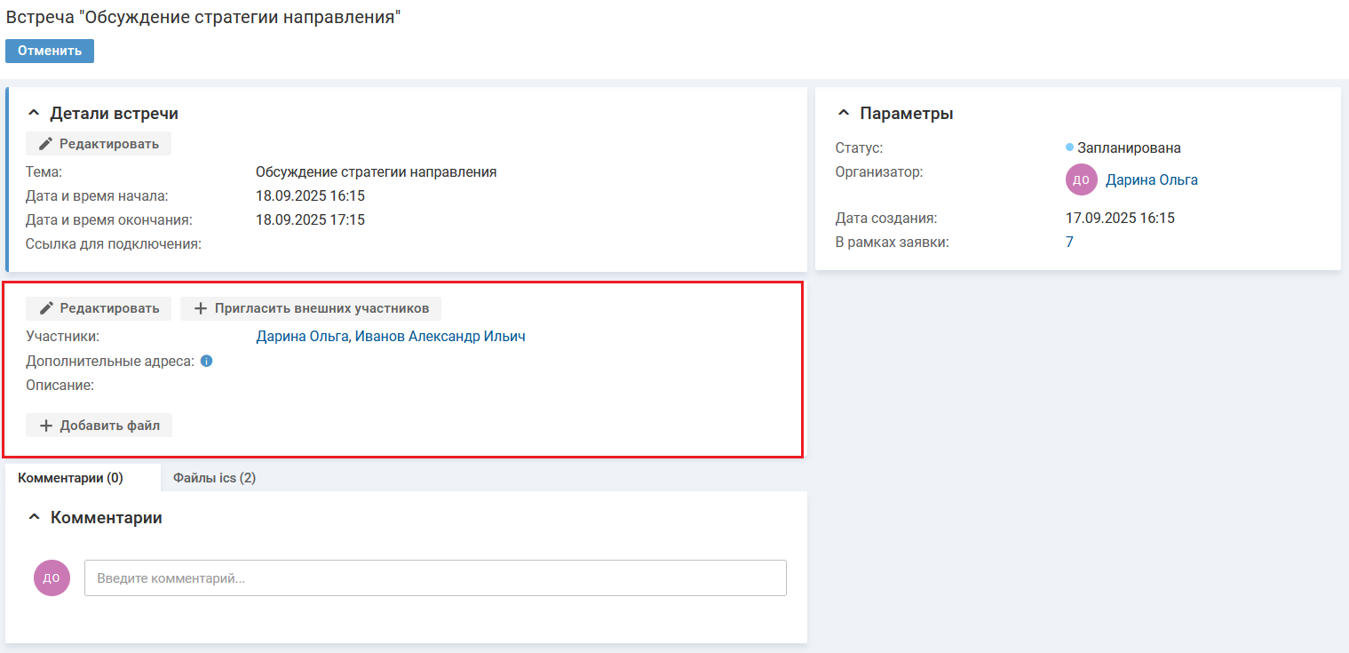 Изменить информацию об участниках встречи