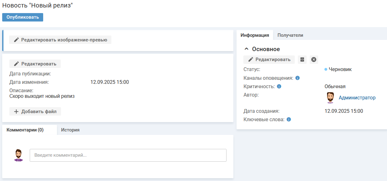 Чтобы внести изменения, в карточке новости в блоке с информацией, которую необходимо изменить, нажмите кнопку "Редактировать". На форме редактирование измените данные и нажмите кнопку "Сохранить".