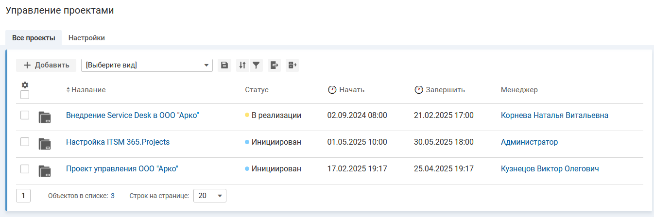 Чтобы посмотреть список проектов, в левом меню раскройте пункт "Процессы" и выберите пункт "Управление проектами". На экране отобразится список "Все проекты".