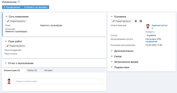 На этапе "В работе" производятся все запланированные изменения. Работы по внедрению изменения проводятся согласно плану внедрения, составленному на этапе планирования. В случае успешного завершения работ изменение переводится на этап проверки.