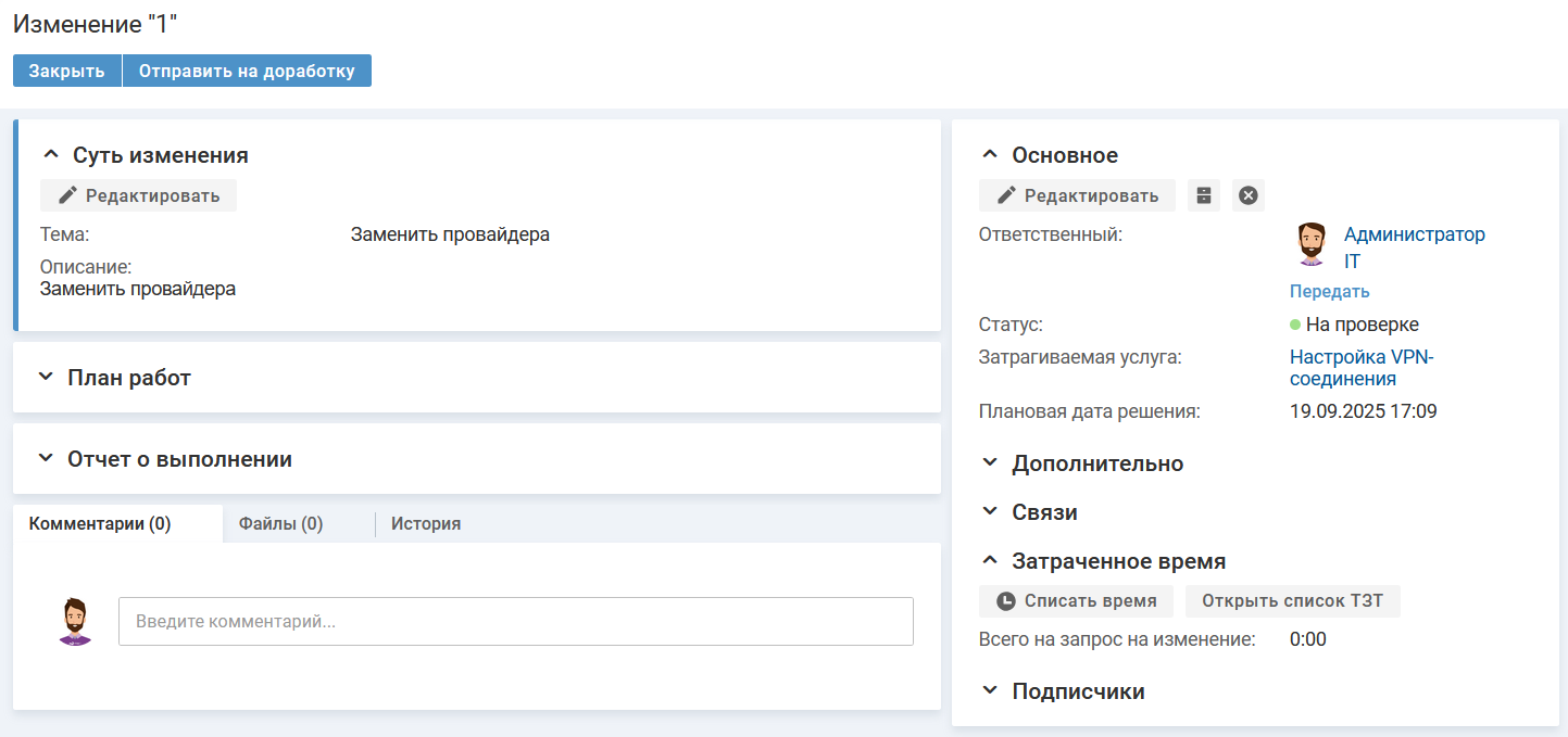 После завершения всех работ по запросу на изменение, специалист закрывает изменение. Статус "Закрыт" является конечным статусом.