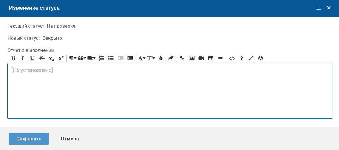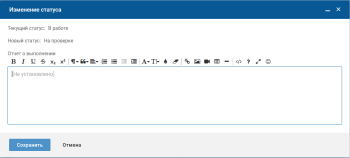 На форме смены статуса заполните поле "Отчет о выполнении" и нажмите кнопку "Сохранить".