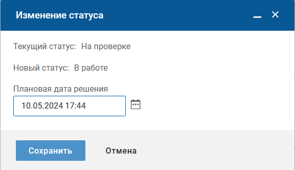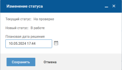 На форме смены статуса заполните поле "Плановая дата решения" и нажмите кнопку "Сохранить".