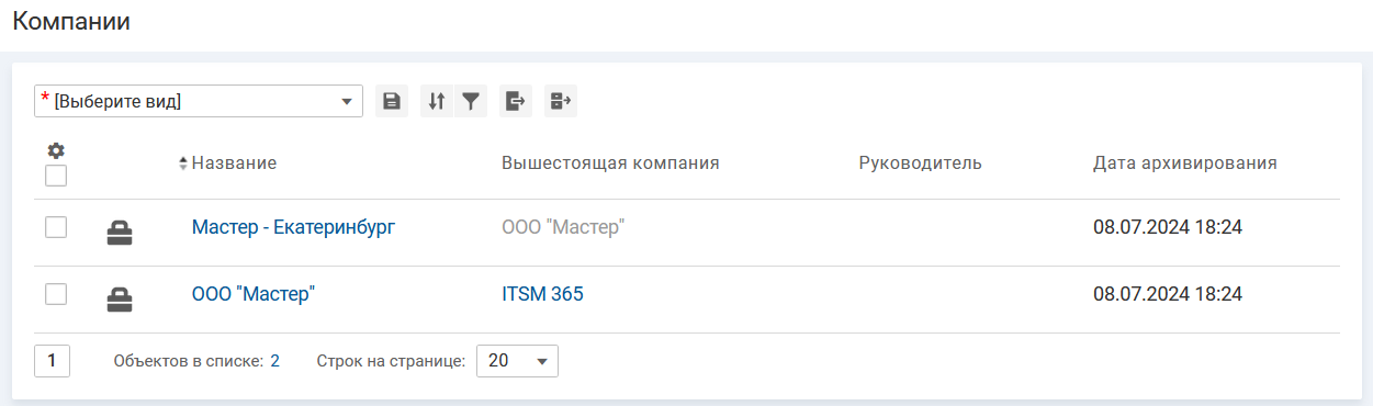 Чтобы посмотреть список архивных объектов, на странице "Компании" перейдите к плоскому виду списка и нажмите иконку на панели действий списка.