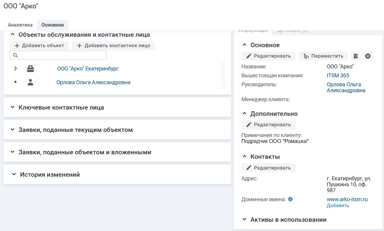 - "Активы в использовании" — отображаются активы, пользователем которых являются контактные лица данного объекта обслуживания.