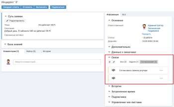 Специалист может просмотреть список согласований по заявке в карточке заявки в блоке "Связи" на вкладке "Согласования" .