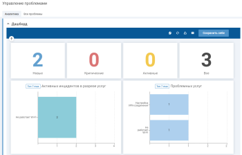 количество новых проблем (в статусе "Новая"), критических (с уровнем влияния "Критический"), активных (в статусе "Новая", "На диагностике", "В работе", "На применении решения", "Отложена") и всех проблем;