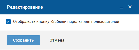 - На странице настроек в блоке "Настройки формы входа" нажмите кнопку Редактировать, на форме редактирования установите или снимите флажок Отображать кнопку "Забыли пароль" для пользователей и нажмите кнопку Сохранить.