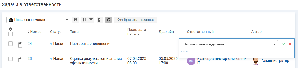 - Лидер команды может передать задачу в ответственность любому участнику команды, своей команде, другой команде или взять задачу себе.