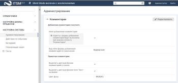 Чтобы настроить режим добавления комментариев, в навигационном меню выберите "Настройка системы" → "Администрирование" (блок "Комментарии").