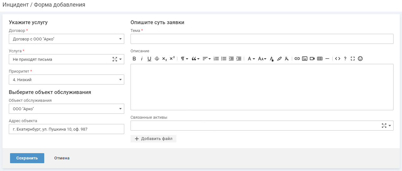 После выбора и уточнения тематики заявки откроется форма добавления.
