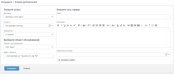 - Адрес объекта — подставляется автоматически, если заполнен у объекта обслуживания. Если адрес не заполнен или отличается, то укажите адрес объекта обслуживания, на котором требуется провести работы в рамках заявки.