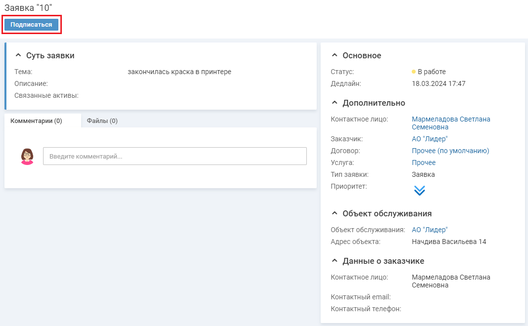 Чтобы подписаться на заявку, в карточке заявки нажмите кнопку "Подписаться".