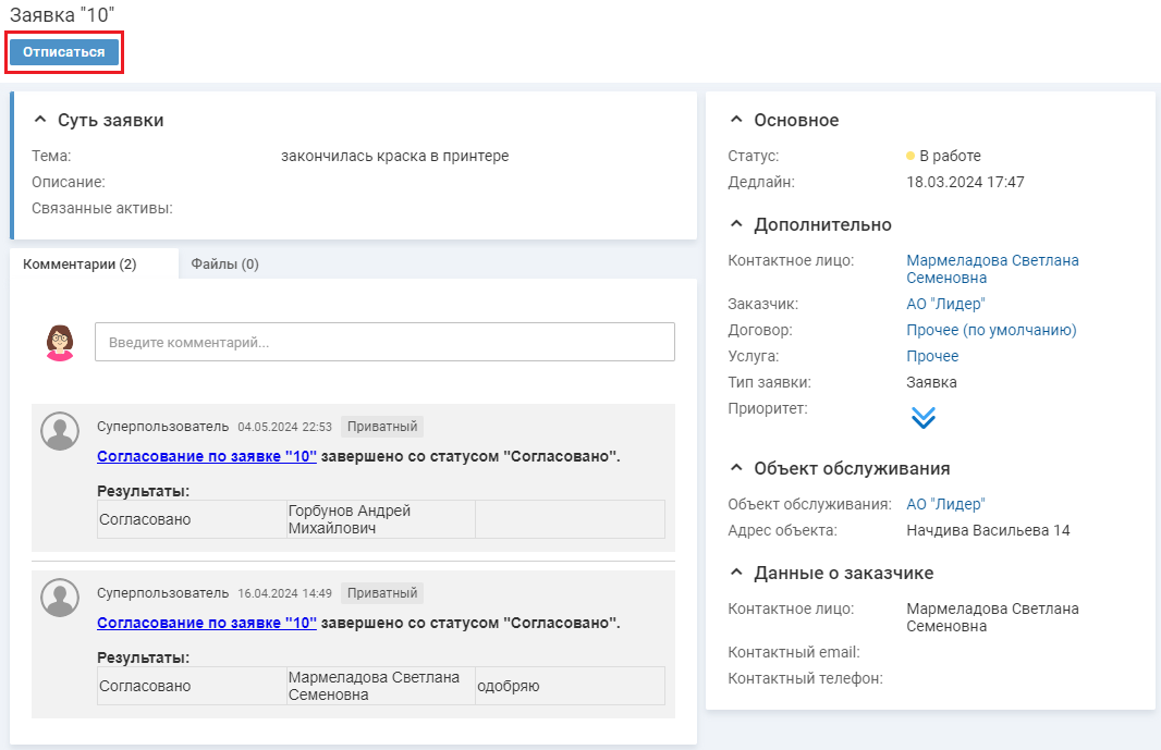 Чтобы отписаться от заявки, в карточке заявки нажмите кнопку "Отписаться".