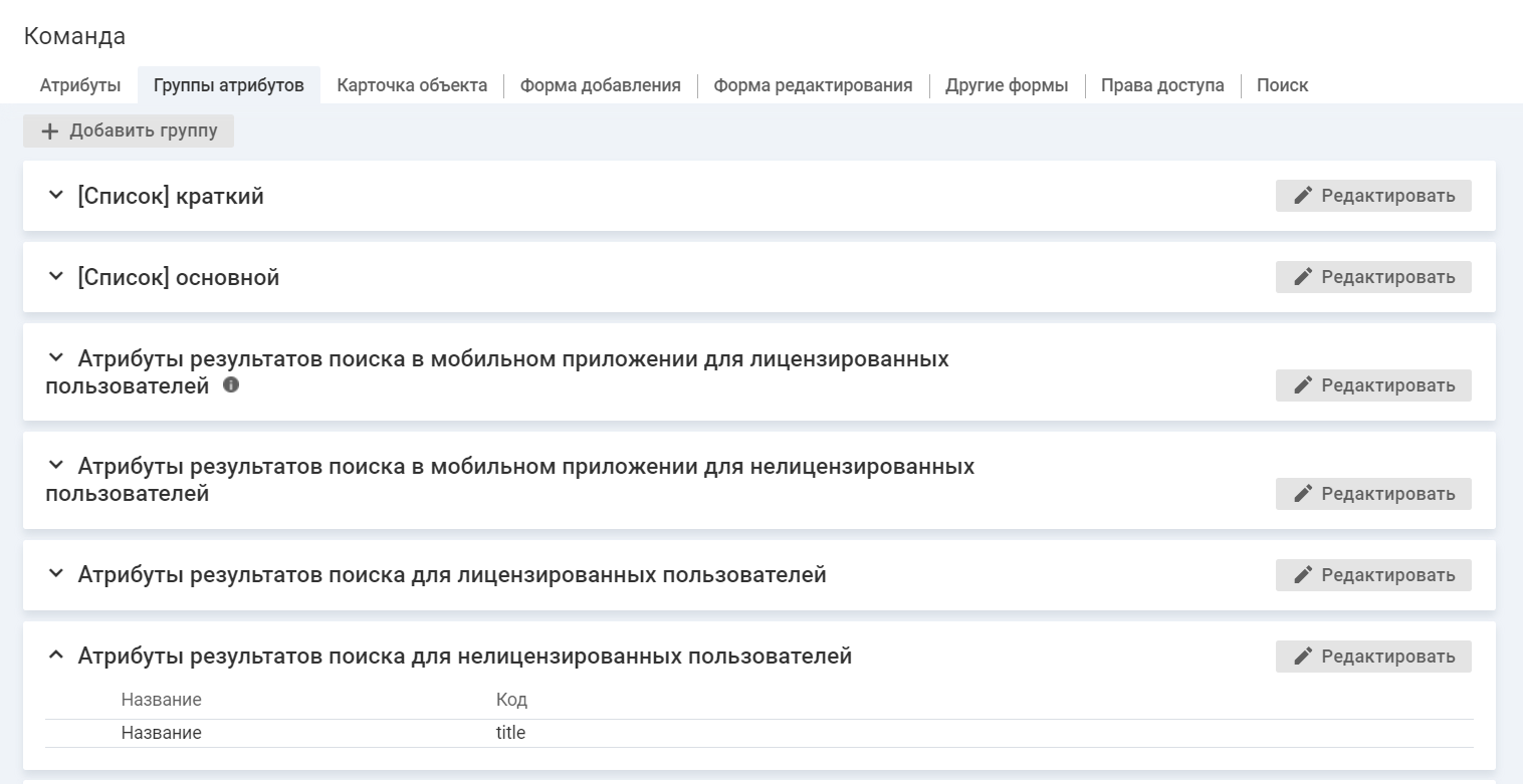 Группы атрибутов могут отображаться в развернутом и свернутом виде (только название группы). Чтобы развернуть или свернуть группу атрибутов, нажмите на название группы.