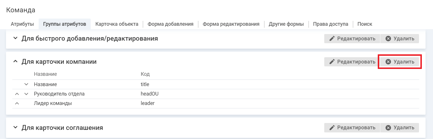 В карточке класса/типа можно удалить группы атрибутов, созданные в самом классе/типе. Кнопка Удалить отсутствует для системных групп атрибутов и для групп атрибутов, унаследованных от родительского класса/типа.