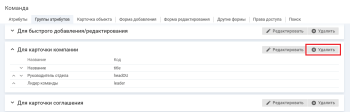 При попытке удаления группы атрибутов, задействованной в настройке контентов карточки объекта, списков объектов и прочее, выводится сообщение об ошибке. Для удаления группы необходимо устранить причину, указанную в сообщении об ошибке.