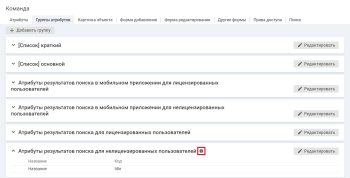 - Перейдите на вкладку "Группы атрибутов" и нажмите кнопку Удалить рядом с названием группы.