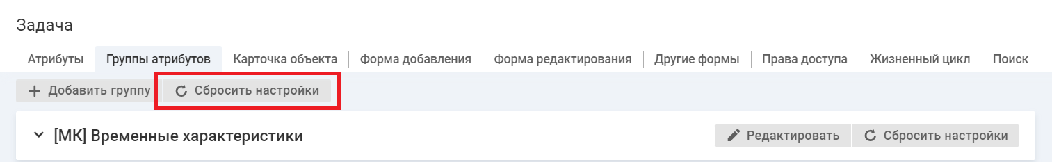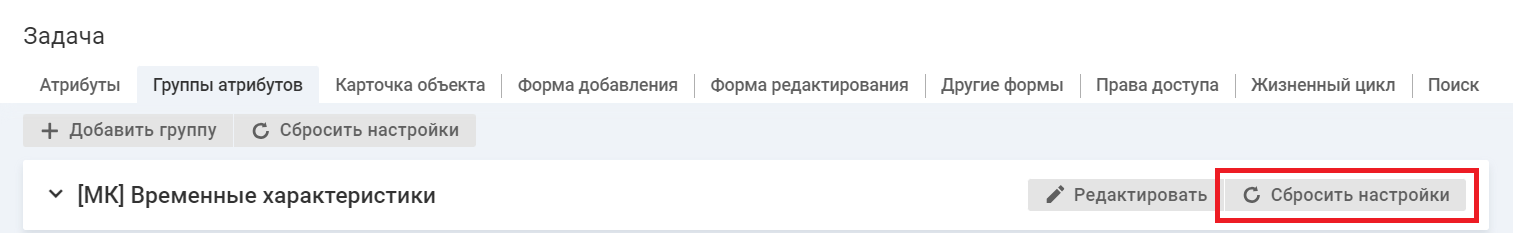 В карточке типа объектов на вкладке "Группы атрибутов" нажмите кнопку Сбросить настройки рядом с названием группы атрибутов.