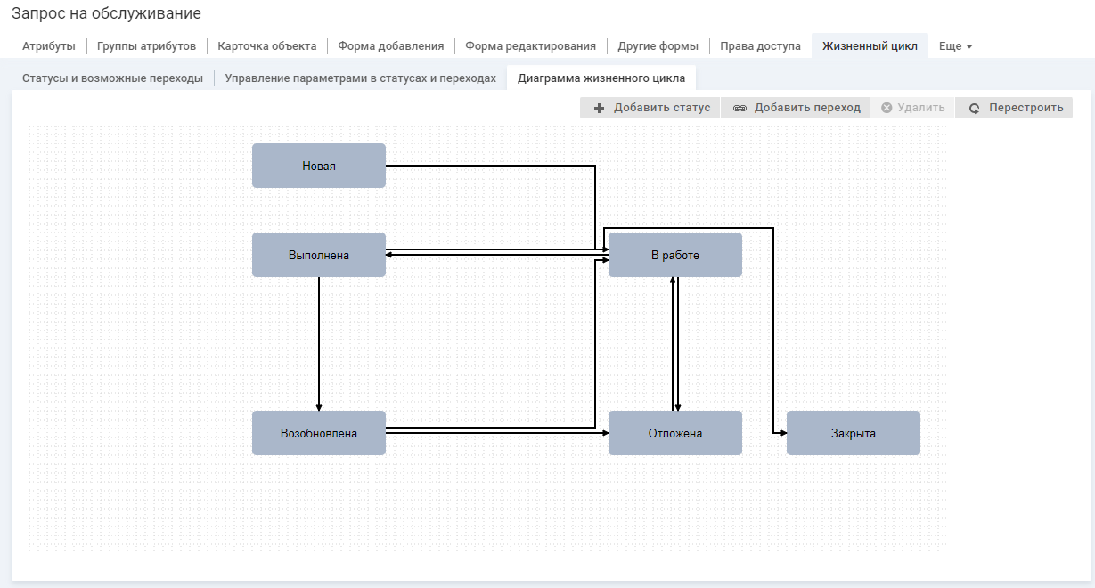 При настройке переходов между статусами следует соблюдать целостность жизненного цикла объекта: