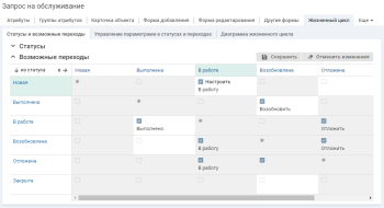 Возможные переходы между статусами настраиваются для каждого класса объектов, у которого включен жизненный цикл, и его типов.
