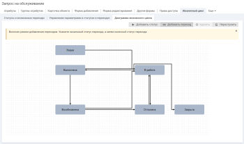 На вкладке "Жизненный цикл" (вложенные вкладки "Статусы и возможные переходы" и "Диаграмма жизненного цикла") по умолчанию отображаются переходы стандартного жизненного цикла объектов, см. Вкладка "Жизненный цикл"
