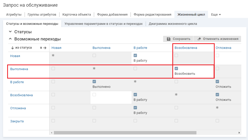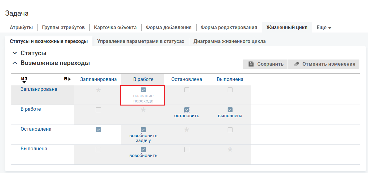 Возможные переходы между статусами настраиваются для каждого класса/типа объектов на вкладке "Жизненный цикл".