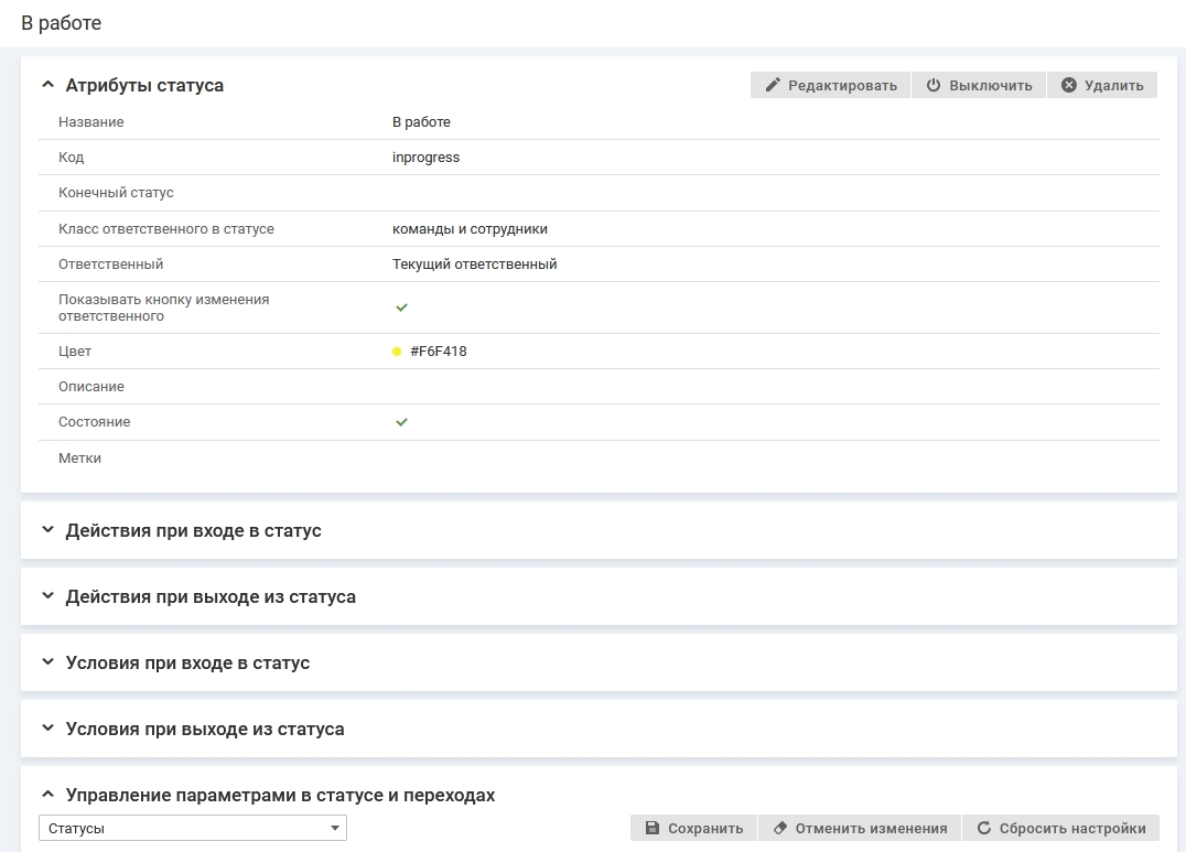 В карточке статуса хранится вся информация о настройках статуса: атрибуты статуса, действия и условия при входе в статус и выходе из статуса, поведение атрибутов объекта в данном статусе.