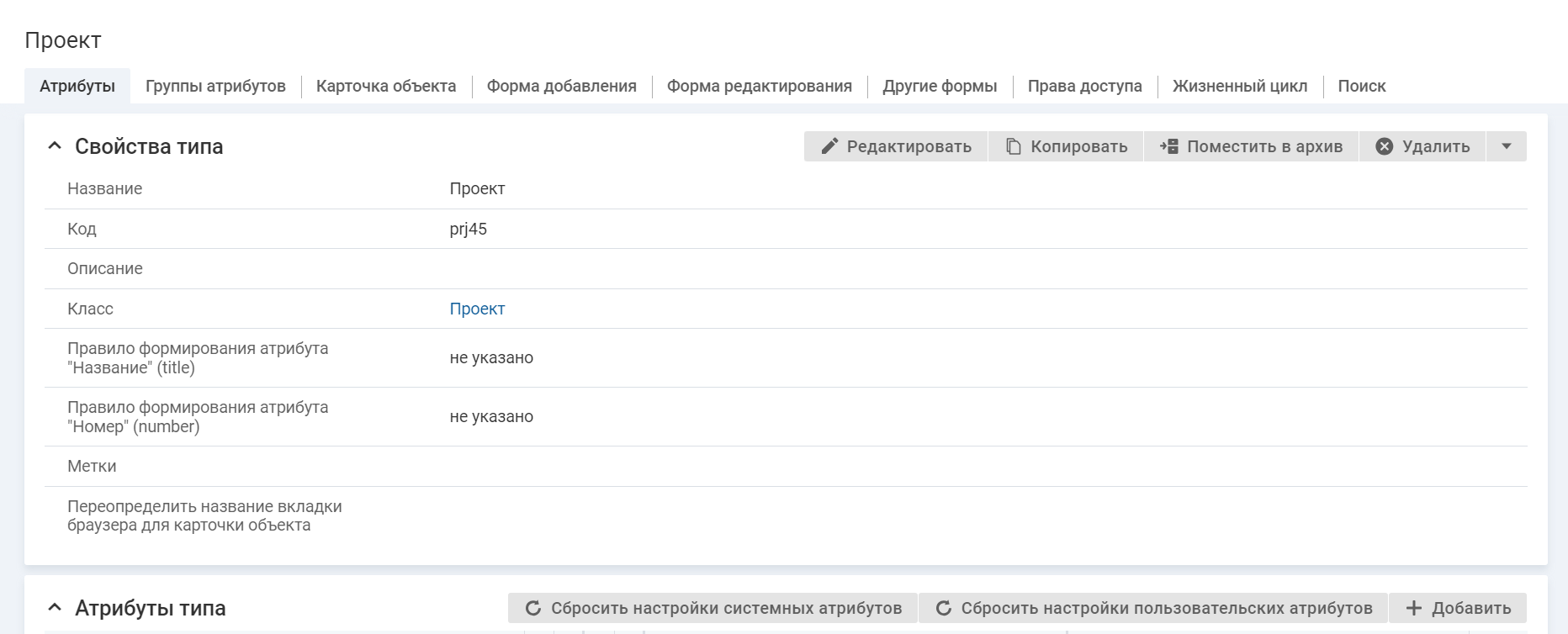 Меню навигации "Классы" → класс → вкладка "Атрибуты" → блок "Свойства класса/типа".