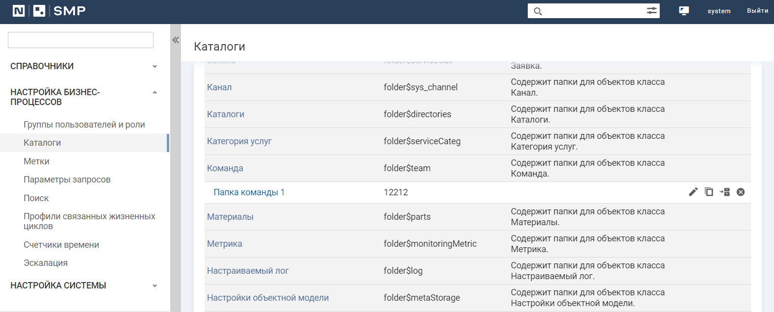 Список каталогов и иерархия папок наглядно отображены на странице "Каталоги" (в меню навигации выберите "Настройка бизнес-процессов" → "Каталоги").