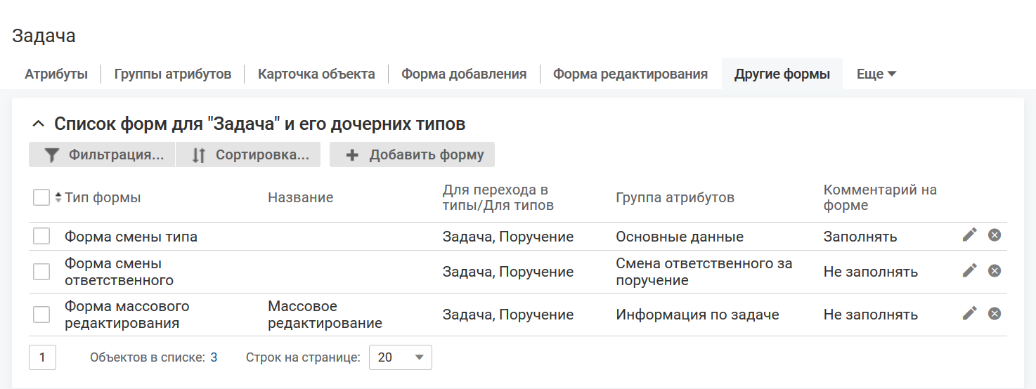 Для каждого типа объектов может быть неограниченное количество форм массового редактирования.