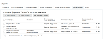 Чтобы изменить параметры формы массового редактирования, в меню навигации выберите "Классы" → "Основной класс" → название класса /типа, перейдите на вкладку "Другие формы", нажмите иконку в строке формы. На форме редактирования измените параметры формы (тип формы не редактируется) и нажмите кнопку Сохранить.