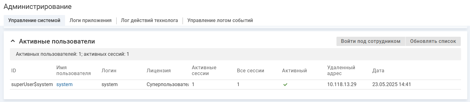 Раздел меню "Настройка системы → раздел "Администрирование" → вкладка "Управление системой" → блок "Активные пользователи".