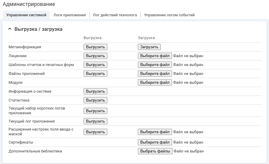 1. На вкладке "Управление системой" → блок "Выгрузка/ загрузка" → строка "Метаинформация" нажмите кнопку Загрузить,