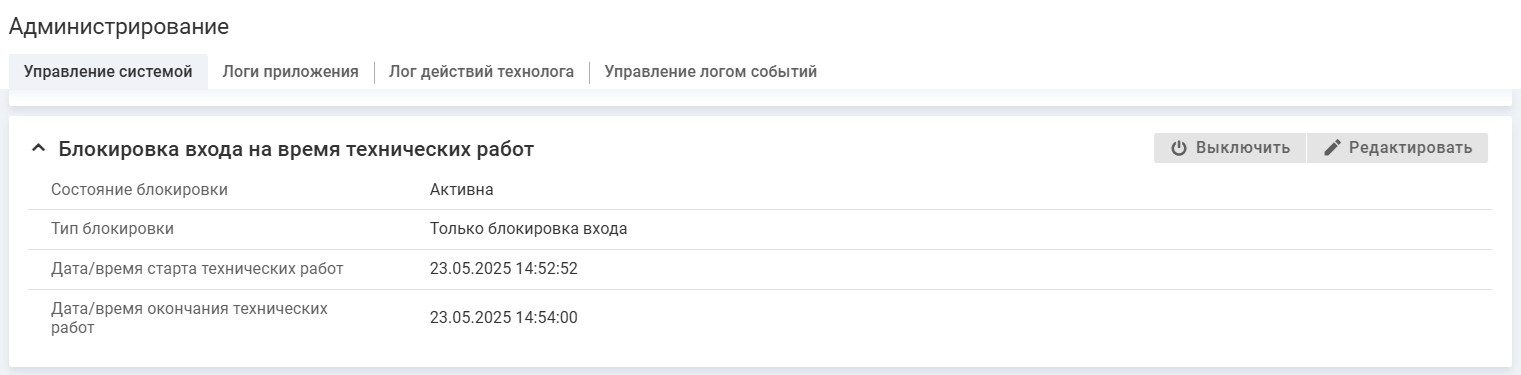 Для активной блокировки можно изменить тип блокировки и дату/время окончания технических работ (кнопка Редактировать) или выключить блокировку (кнопка Выключить).